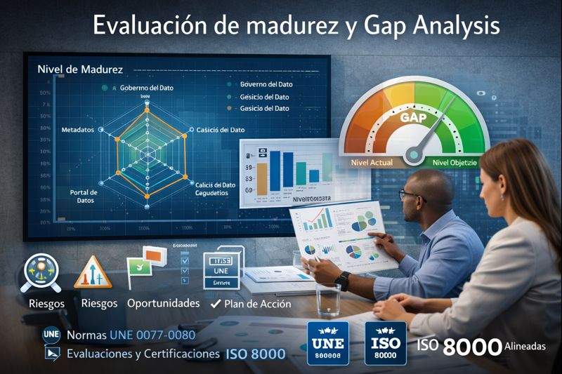 Utilizamos como referencia las normas UNE 0077–0080, identificando brechas, riesgos y oportunidades de mejora, y definiendo un plan de acción priorizado y realista.